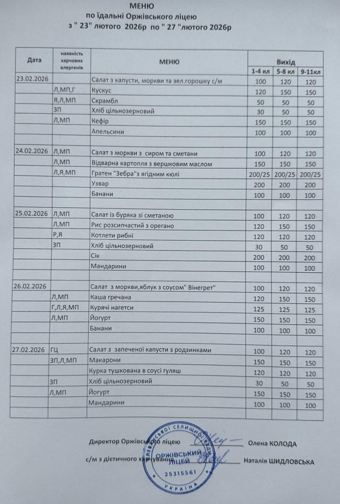 Меню їдальні 23-27 лютого 2026
