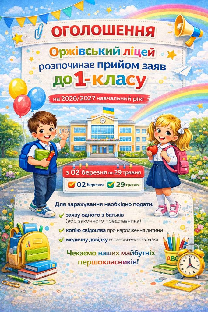 Оржівський ліцей розпочинає прийом заяв до 1-го класу на 2026/2027 навчальний рік!